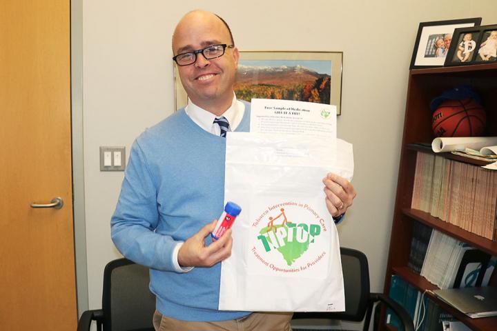 image: Dr. Matthew Carpenter shows off the smoking cessation goody bag that helped people quit smoking.