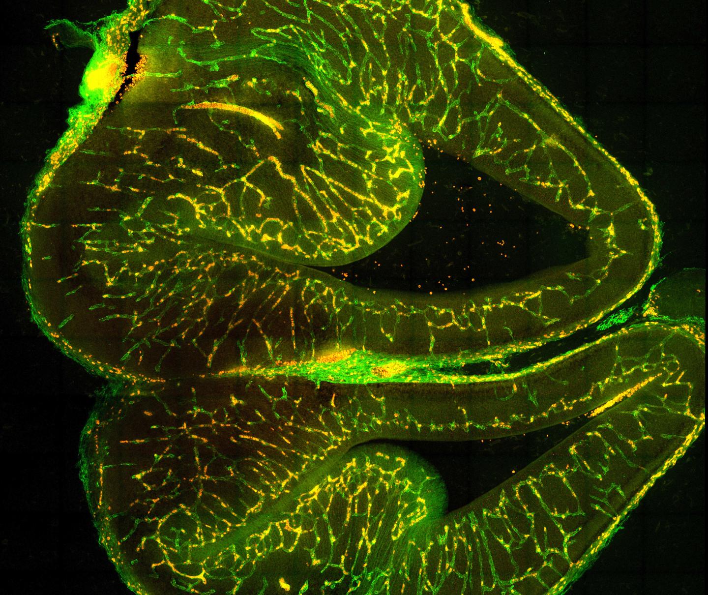 image: Slice of an embryonic mouse brain showing the development of vascular endothelial cells (green) and mural cells (red). The latter can contract and thus influence the blood flow in the vessels.