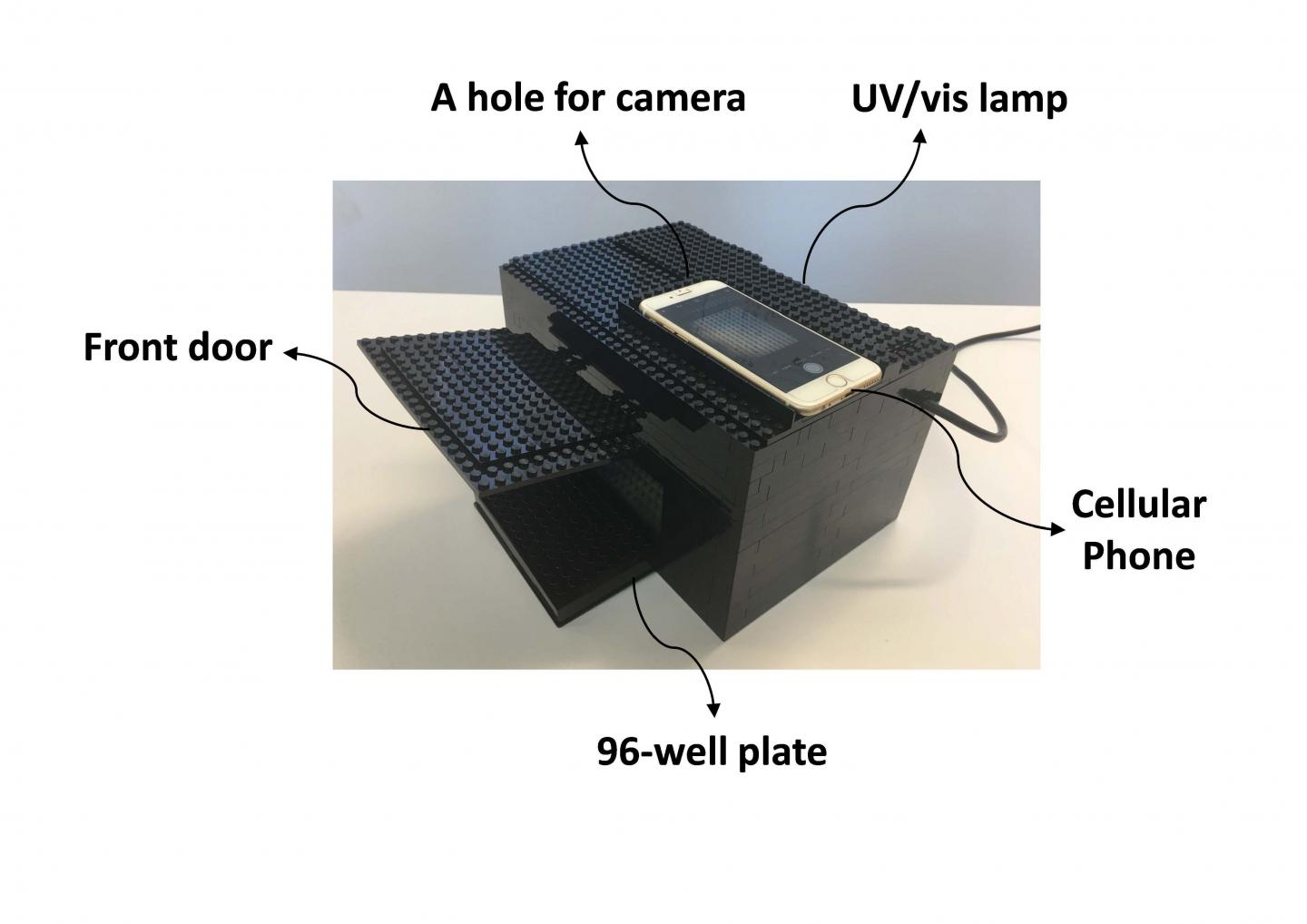 The researchers developed a cascade of reactions that amplify an optical signal that results from a byproduct of a decomposition reaction of the nerve agents. The resulting mixtures change their color and intensity of emission relative to the amount of chemical weapon present. This visual change of emission provides a sensitive test that can be read using common, inexpensive household and laboratory items. The simple design features a LEGO® box with a template to guide a smartphone's placement on a stage, where the phone acts as the instrument's camera. The only other necessary components are a UV/visible lamp and a standard 96-well test plate. Free software helps analyze the resulting image. To encourage wide adoption of their technology, the researchers uploaded their analytic code, image guides, and a demonstration video to GitHub.