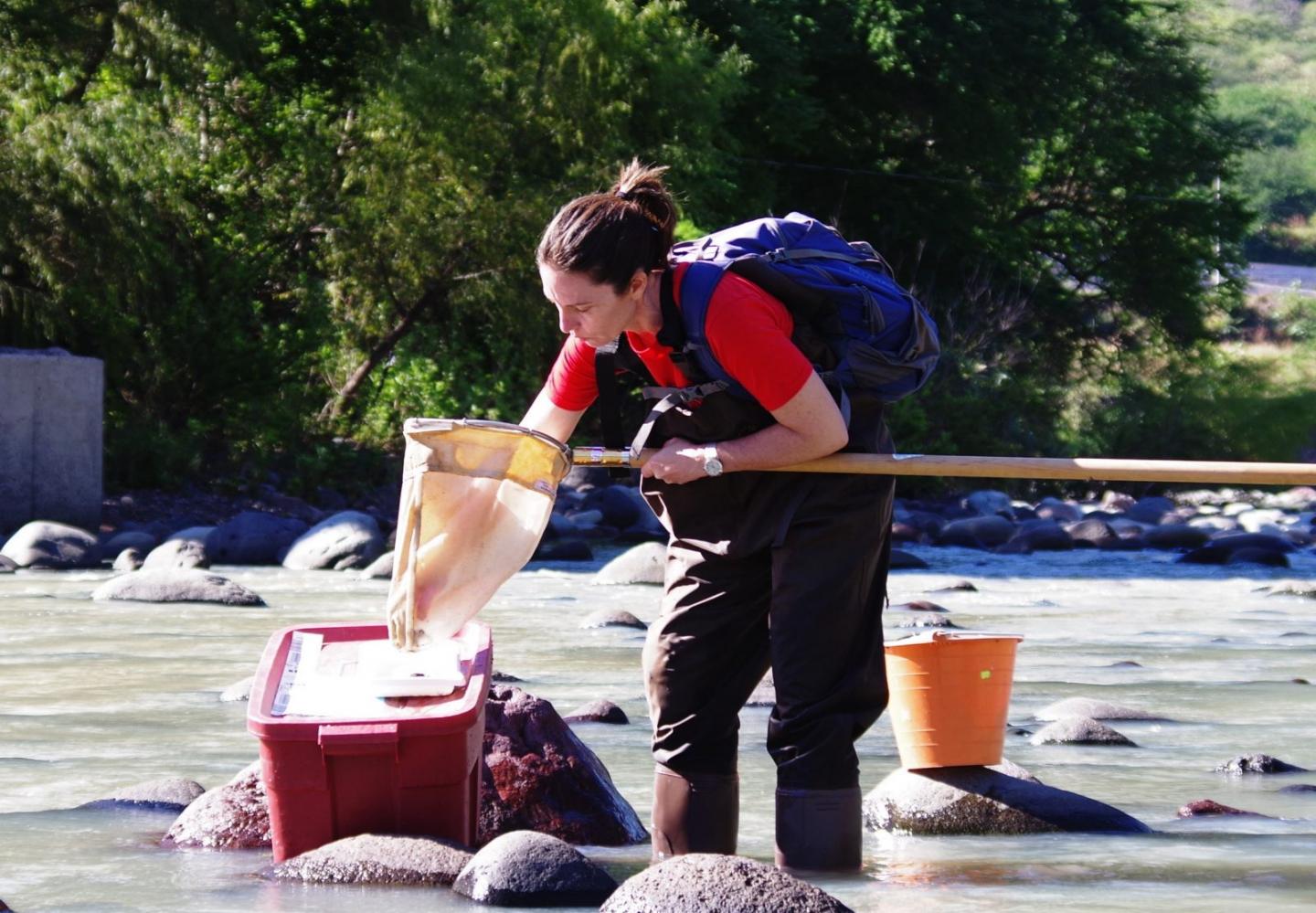 image: Sally Entrekin samples a stream in search of aquatic insects, including mayfly nymphs.