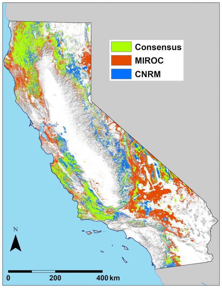 image: This map marks refugia for California's vegetation by 2099 under conditions projected by global climate models. Green represents 'consensus' areas expected to remain suitable for the vegetation currently there under both wetter and drier conditions. Blue represents refugia under wetter conditions, while red indicates suitable areas when conditions are drier.