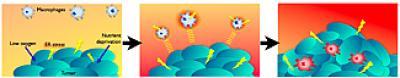 An artist's representation shows how stress signals from cancer cells prompt similar signals in neighboring cells, aiding and abetting tumor growth. Left: To survive in a harsh environment (low oxygen, nutrient deprivation), tumor cells produce constant endoplasmic reticulum (ER) stress response. Center: These ER stress signals are transmitted to nearby macrophages white blood cells charged with recognizing and removing tumor cells and pathogens. The macrophages react with their own ER stress signals, initiating an inflammation response. Right: The resulting macrophage-amplified inflammation encourages more tumor growth.