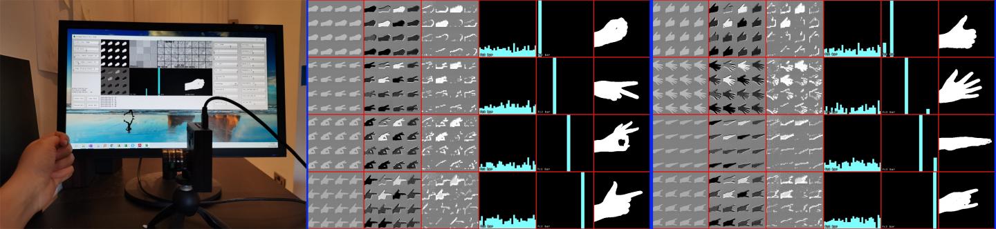 image: A Convolutional Neural Network (CNN) on the SCAMP-5D vision system classifying hand gestures at 8,200 frames per second