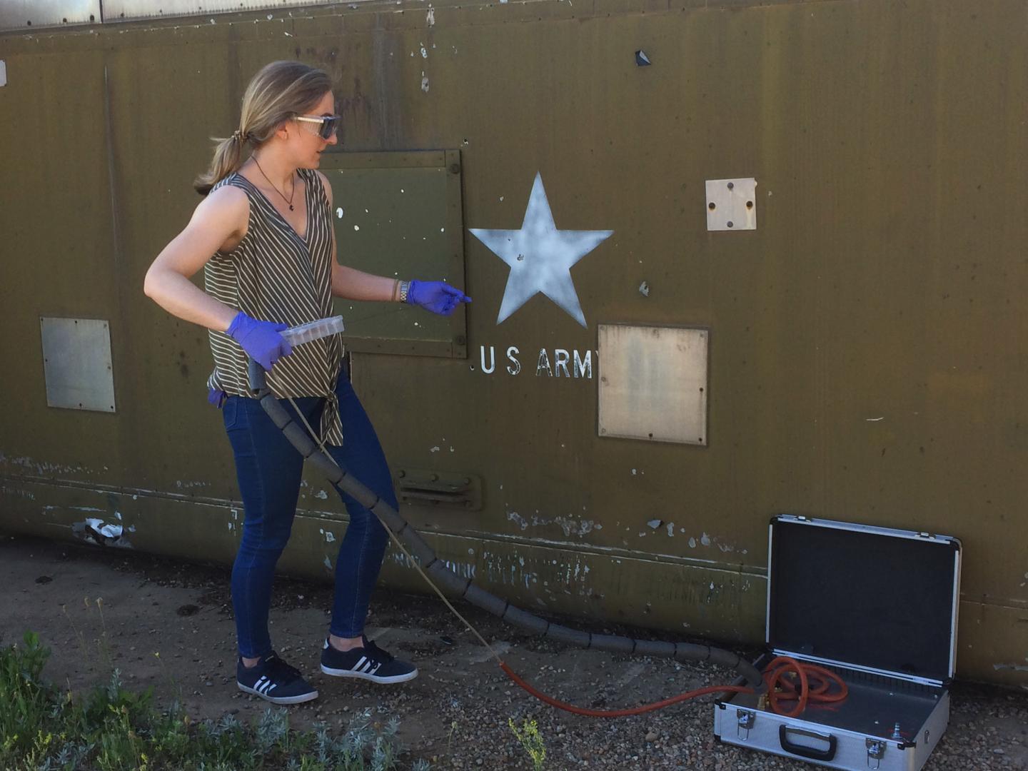 image: NIST chemist Megan Harries tests whether a portable, high-tech sniffing device called a PLOT-cryo system can be used to screen shipping containers for dangerous airborne chemicals at ports of entry. For this test, which was performed at the NIST campus in Boulder, Colo., Harries used an old US Army communications bunker as a stand-in for a shipping container.