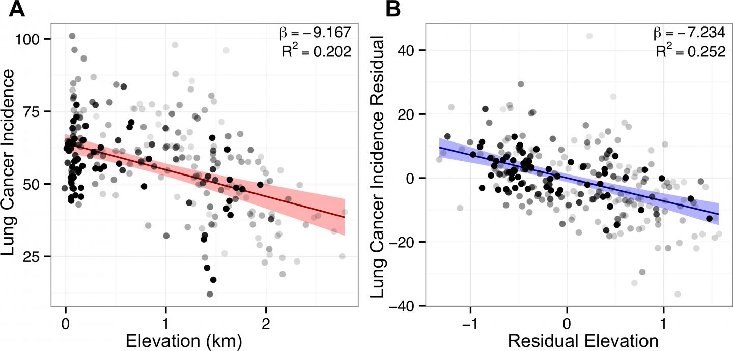 In the left hand panel, lung cancer incidence is plotted against elevation for western US counties. Darker counties have higher populations and thus lower observational errors. The right hand panel shows the association when accounting for additional factors, such as smoking and education.Credit: Simeonov and HimmelsteinThe observed association does not prove that oxygen causes lung cancer. The study looked at groups of people rather than individuals and many variables in addition to oxygen levels are correlated with elevation. Accordingly the researchers performed a thorough analysis to investigate confounding potentials. Their model accounted for important risk and demographic variables, such as smoking prevalence and education. The association was consistent across population subgroups, states, and models that included a range of additional factors.