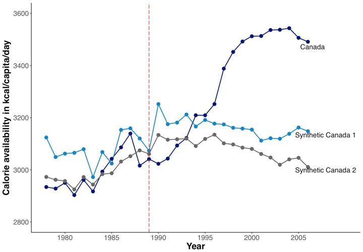 image: These are trends in calorie availability in Canada and synthetic controls, 1978-2006. Data from the United Nations Food and Agricultural Office (2016). 'Synthetic controls' are constructed from a weighted combination of OECD countries, where weights correspond to the similarity of each country with Canada before CUSFTA.