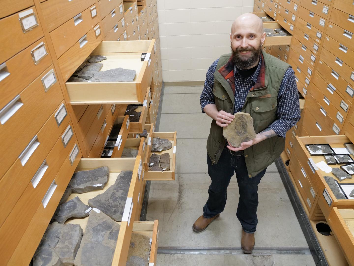 image: Christopher West in the midst of 4,000 fossils from the USask fossil collection.