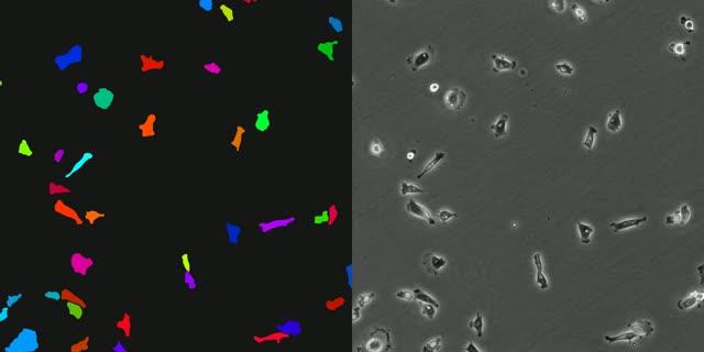 video: Timelapse video showing breast cancer cells in the lab responding and changing shape when they encounter other cells (right), and the computer vision programme interpretation (left)