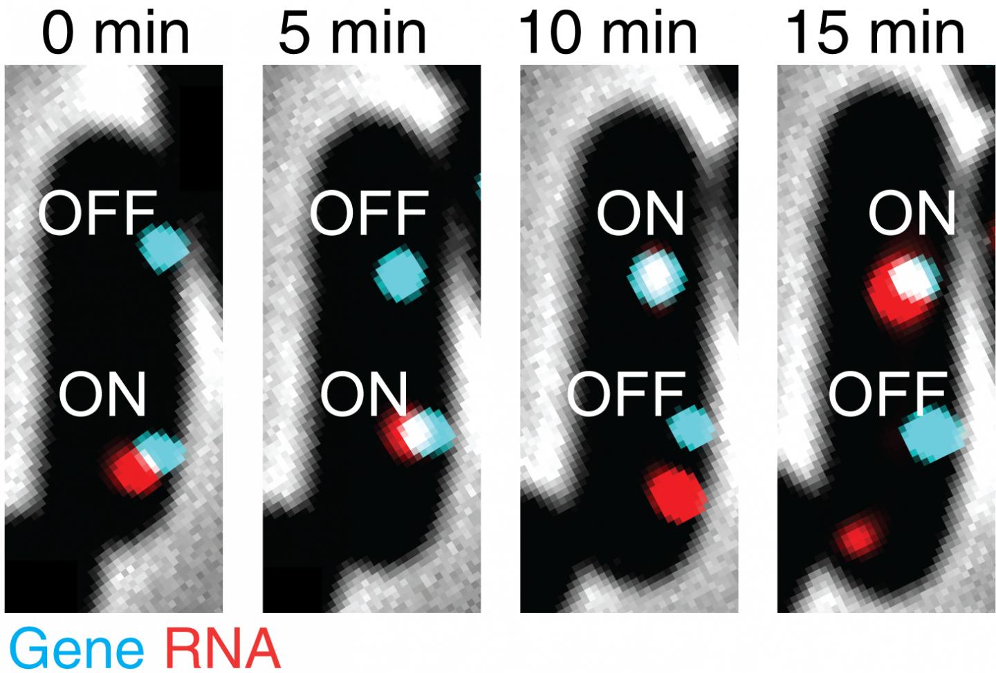 image: An individual E. coli bacterium is followed over time under the microscope. Two identical chromosomal copies of a single gene are labeled in cyan. The transcriptional activity of each copy is identified by the presence of RNA (red) at the gene.