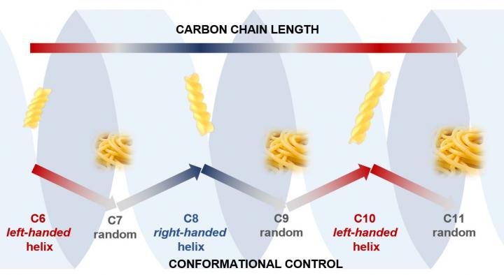 The Bristol team, from the University's School of Chemistry, showed that by judicious insertion of methyl substituents along carbon chains they could control their shape so that they adopted well-defined linear (penne) or helical (fusilli) conformations.