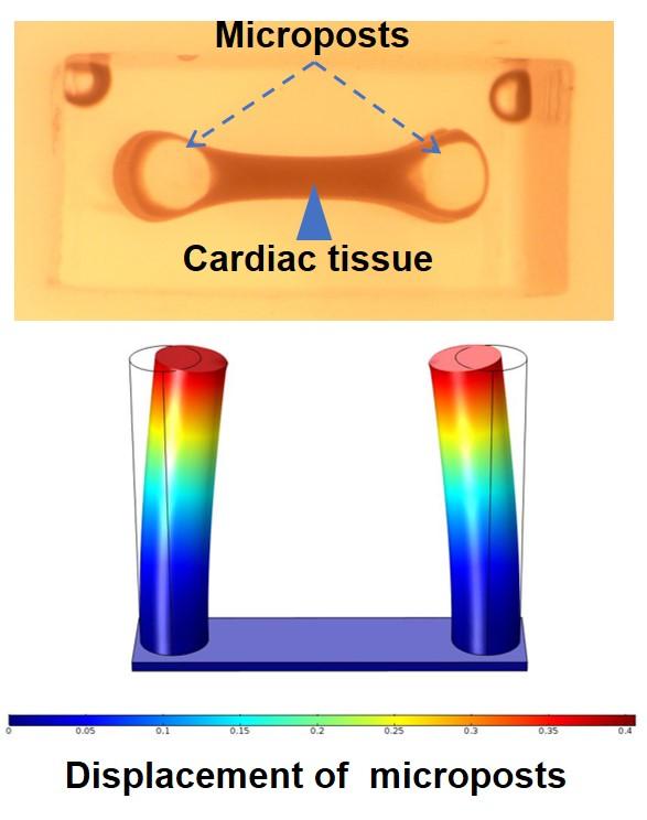 image: Contraction force measurement for cardiac tissue. Formation of tissue between microposts (top image). Simulation of micropost displacement due to tissue contraction (bottom image).