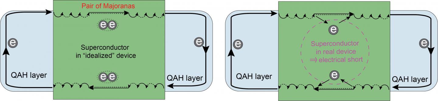 image: An exotic quantum state known as a "chiral Majorana fermion" is predicted in devices wherein a superconductor is affixed on top of a quantum anomalous Hall (QAH) insulator (left panel). Experiments performed at Penn State and the University of Würzburg in Germany show that the millimeter-size superconductor strip used in the proposed device geometry creates an electrical short, preventing the detection of chiral Majoranas (right panel).