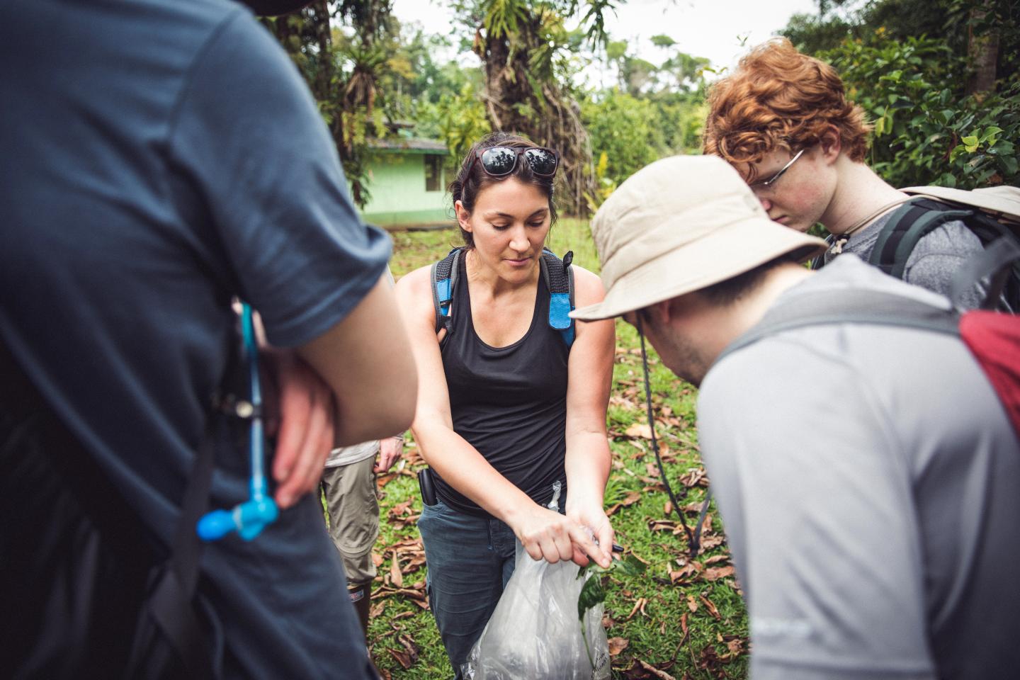 image: Doctoral candidate Danielle Salcido of the University of Nevada, Reno's College of Science works with Earthwatch volunteers in Costa Rica, including this team of high school students from Beacon Academy in Chicago, to collect caterpillar, parasite and plant data for research.