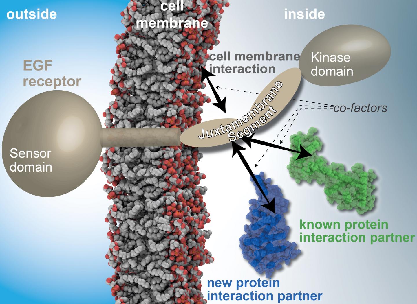 image: Structure and interactions of the EGF receptors. The research work is decoding a new network of factors that can regulate interactions with the juxtamembrane segment.