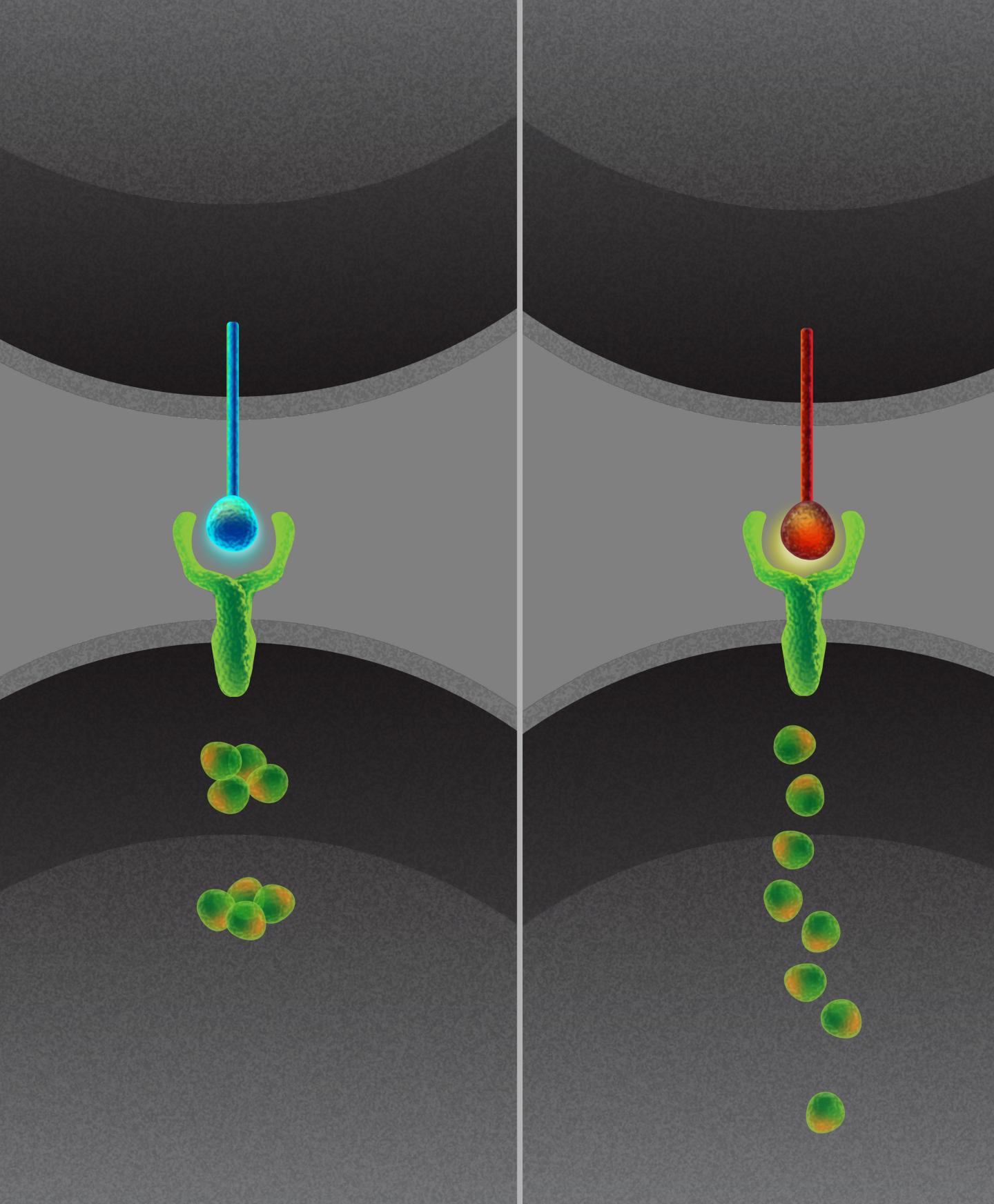 The team studied two chemically similar Notch ligands, dubbed Delta1 and Delta4. They discovered that despite the ligands' similarity the two activated the same receptor with strikingly different temporal patterns. Delta1 ligands activated clusters of receptors simultaneously, sending a sudden burst of transcription factors down to the nucleus all at once, like a smoke signal consisting of a few giant puffs. On the other hand, Delta4 ligands activated individual receptors in a sustained manner, sending a constant trickle of single transcription factors to the nucleus, like a steady stream of smoke.
