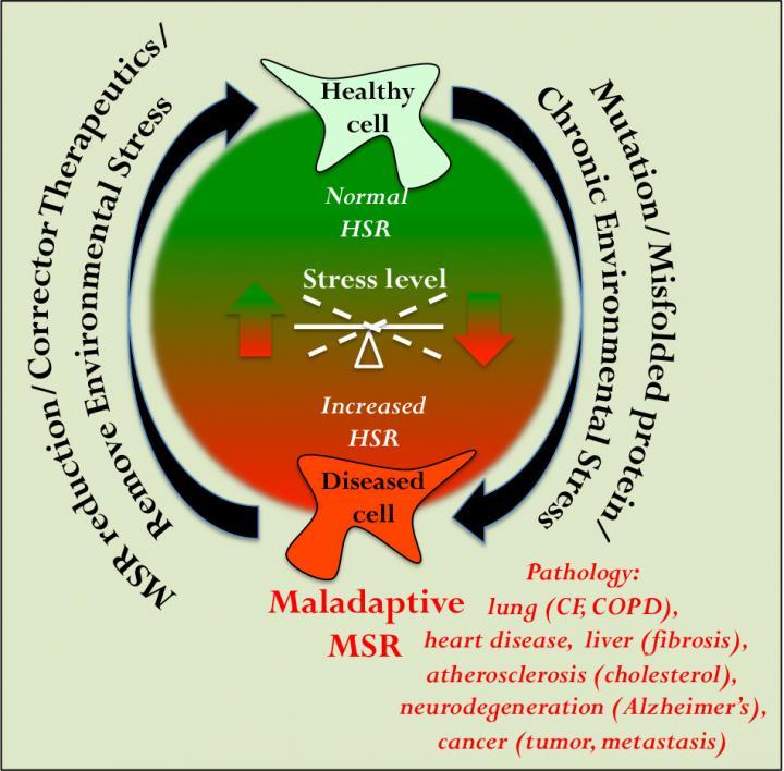 This schematic shows the transition from a healthy protein folding state (green) to an unhealthy, maladaptive state (red) -- a maladaptive stress response -- that occurs in response to chronic inherited disease or sustained exposure to environmental toxins, for example cigarette smoke. Therapeutics or a change in the environment could help restore more normal heat-shock-response pathways and protein folding health.