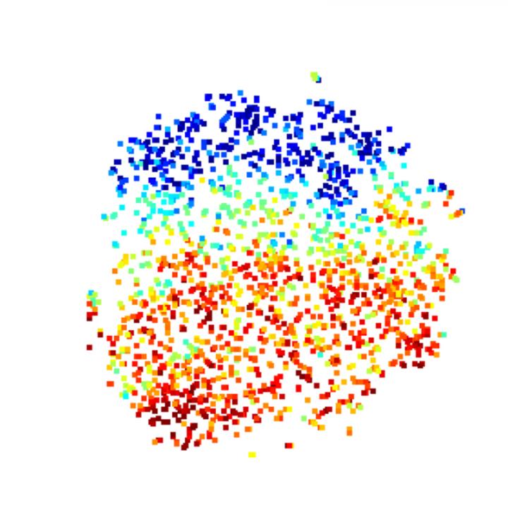 image: Dengue-specific CD4 cells have both a pro-inflammatory function and an anti-inflammatory function, which is typically not seen in acute viral infections. Each dot is a double positive cell with the color of each dot representing the expression level of a protein named TIGIT, which is an inhibitory immunoreceptor, in each cell.