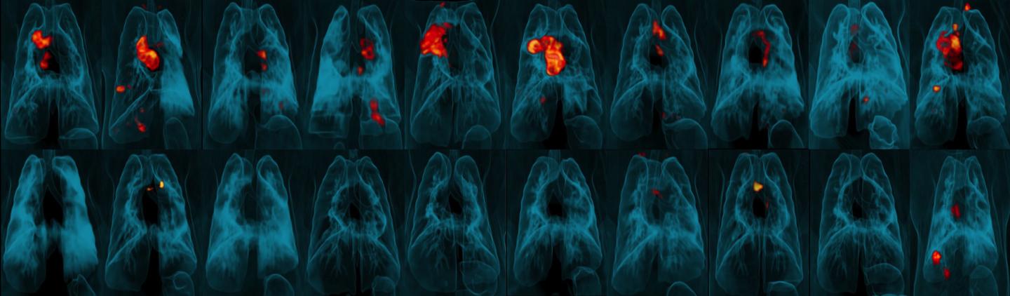 image: Three-dimensional PET-CT scans of lungs showing areas of TB infection and tissue inflammation (red and orange) in macaques challenged with Mtb after vaccination with either ID BCG (top row) or IV BCG (bottom).