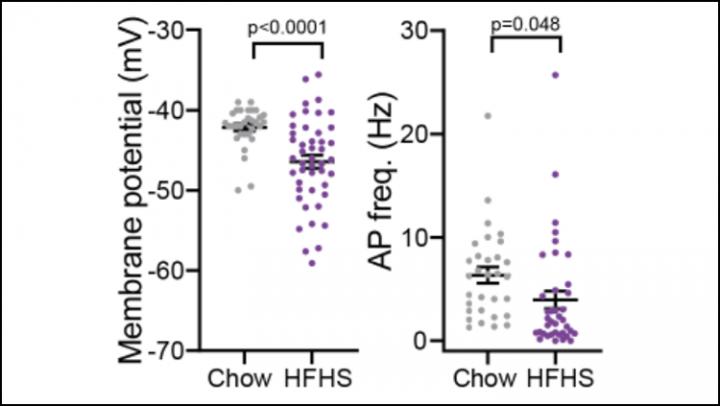 image: A high-fat, high-sugar diet decreases membrane potential (purple, left) and firing rate (purple, right).