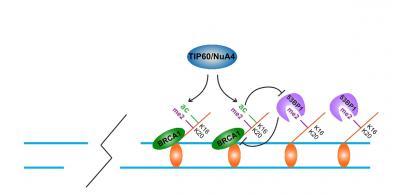 This is a model showing that TIP60/NuA4-dependent acetylation limits 53BP1 binding to histone H4 when present on the same histone H4 tail with the mark H4K20Me2, a recognition mark for 53BP1. A TIP60 deficiency would result in reduced H4 acetylation, and increased 53BP1 binding, thus blocking BRCA1 function at DNA double-strand breaks.