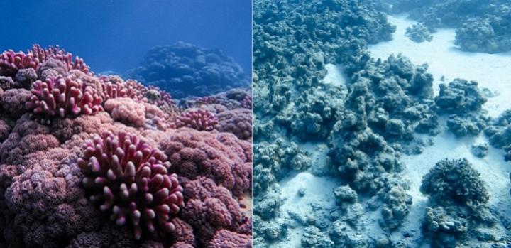 image: A healthy reef (left) compared to a dead coral reef, which has undergone bleaching.