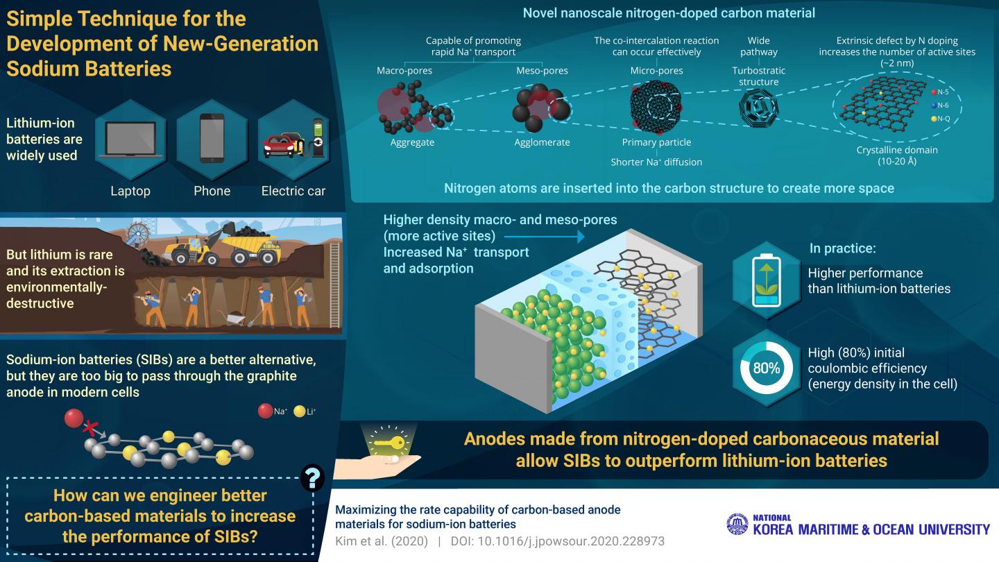 image: Researchers in Korea have developed a "heteroatom-doped" (modified) carbon-based anode that helps sodium-ion batteries to surpass the performance of lithium-ion batteries.