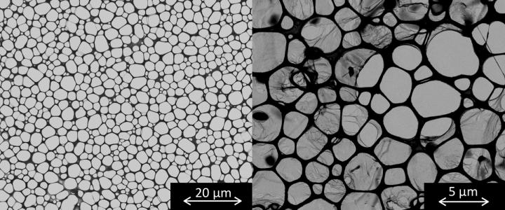 image: Chemists at the University of Tokyo have identified the step of the reaction process where two types of molecules become either an ultrathin sheet or a spherical cage. In these microscopy images, empty wells are seen in the transmission electron microscopy grid (left) and the thin sheet is visible stretching over the same wells (right) after the reaction is complete.