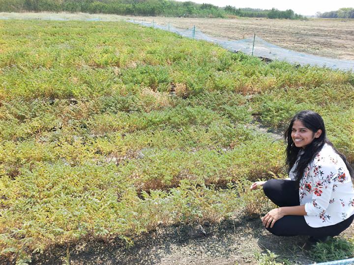 image: Chiti Agarwal, a chickpea researcher, examines plants in a chickpea disease nursery.