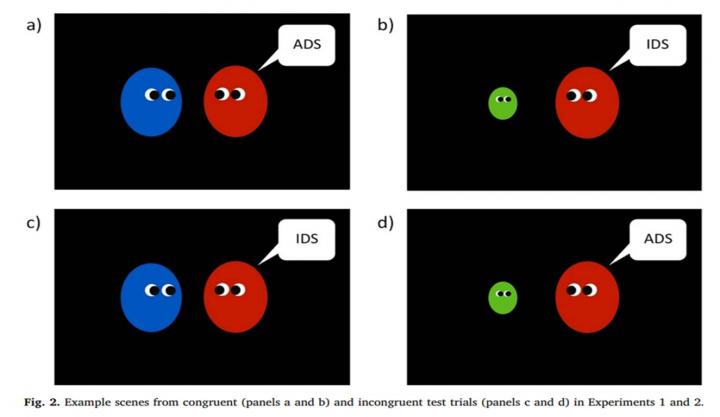 In two of the conditions (Figure 2 a and b of the work), the respective figures communicated congruently, that is, the adult figure addressed the child figure using IDS - infant-directed speech, or another adult using ADS - adult-directed speech. In the other conditions (Figure 2 c and d of the work) this pattern is altered incongruently: the adult spoke to another adult as if the latter were a child, or spoke to the child as if it were an adult. The results showed that both Spanish and Turkish infants aged between 12 and 15 months watched for longer when presented with incongruent than with congruent events. This increased gaze time is interpreted as a reaction of surprise at an unexpected situation.