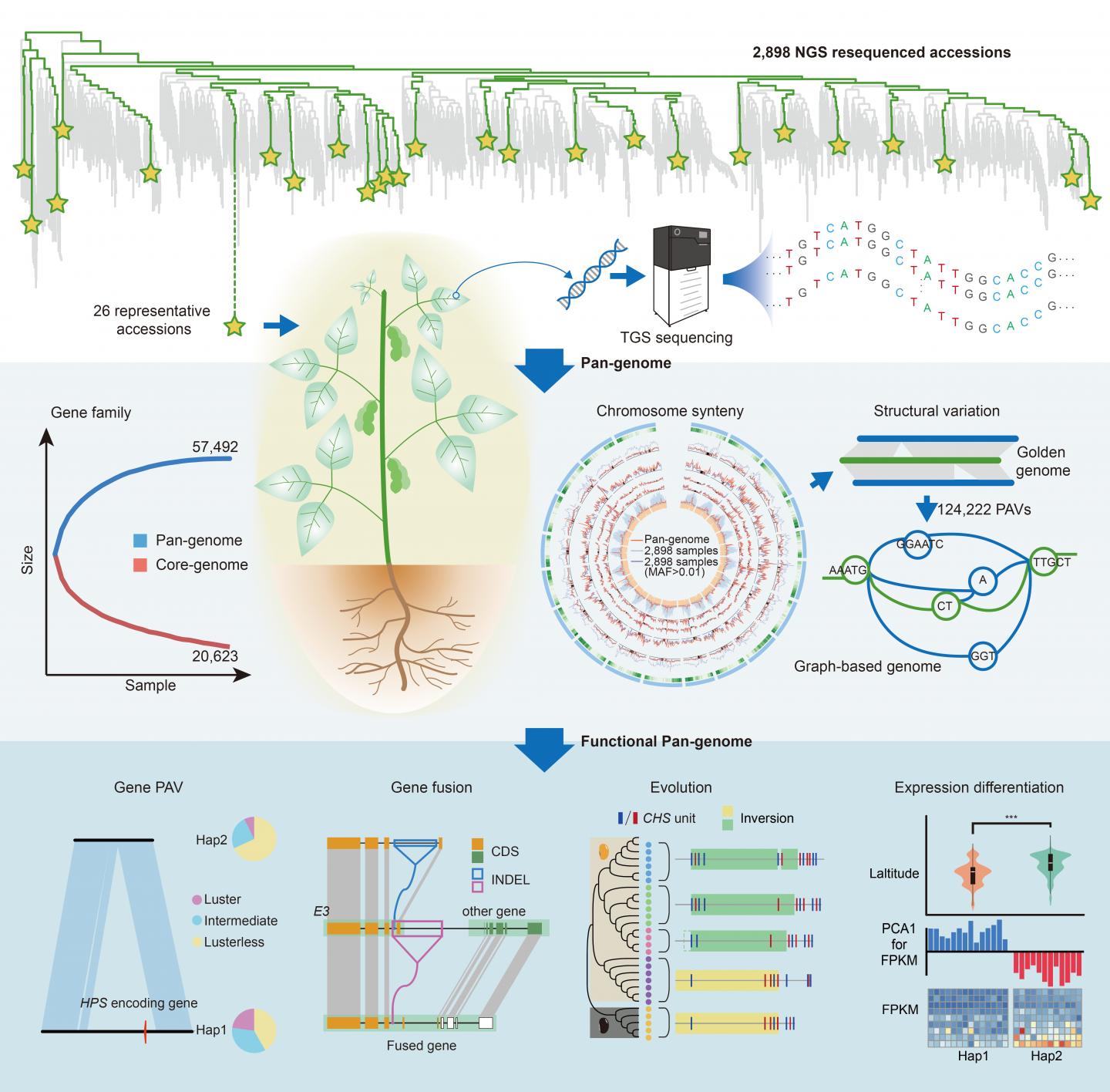 Further investigations illuminated that these structural variations play important roles in driving genome evolution, gene structure variation and gene functional divergence, which in turn contribute to agronomic trait variations in the soybean population.