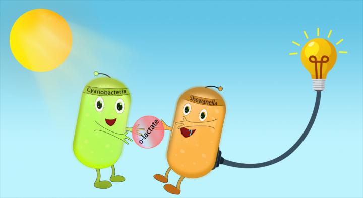 In this microbial consortium, cyanobacteria capture solar energy and fix CO2 to synthesize D-lactate, while Shewanella produce electricity by oxidizing D-lactate, thus creating a constrained electron flow from photons to D-lactate, then to electricity.