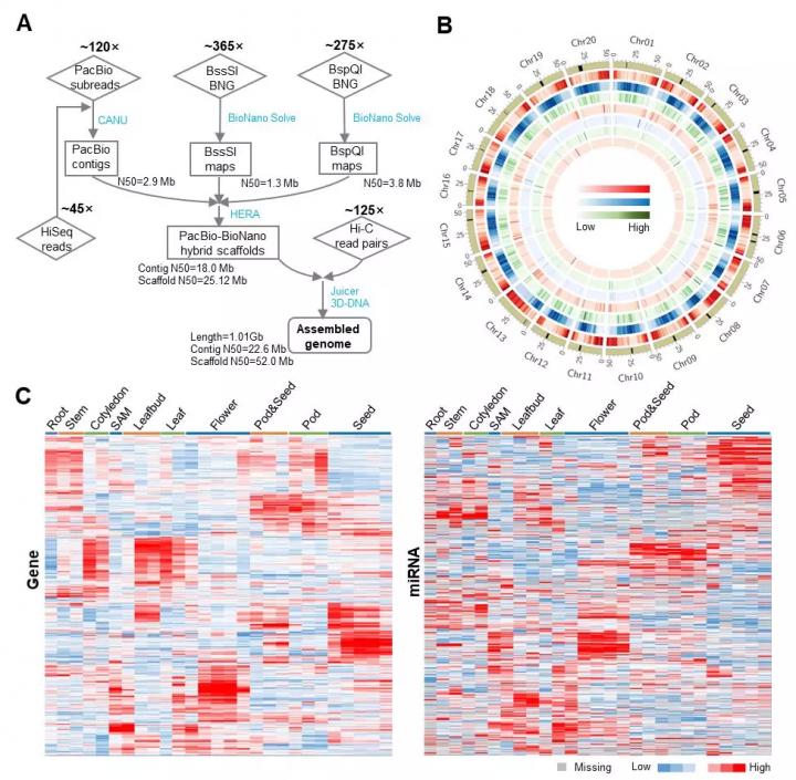 image: A, Pipeline for genome assembly. B, Distribution of genome features. Tracks from outer to inner circles indicate chromosomes, and density of protein coding genes, repeat sequence, snoRNA, tRNA, miRNA, snRNA and rRNA, respectively. The black blocks on the outer circle indicate regions enriched of Cent91/92 (a soybean-specific centromeric repeat). C, Expression profiling of protein coding genes (left panel) and miRNAs (right panel) in 27 samples from different tissues of different development stages.