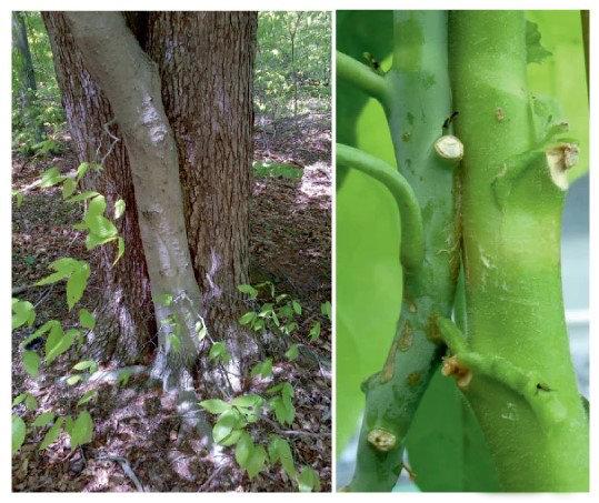 image: A natural stem graft between a beech (front) and a maple (back) in a forest near Monroe, New Jersey (left picture), and an similar stem graft between two tobacco plants (right) in the greenhouse.