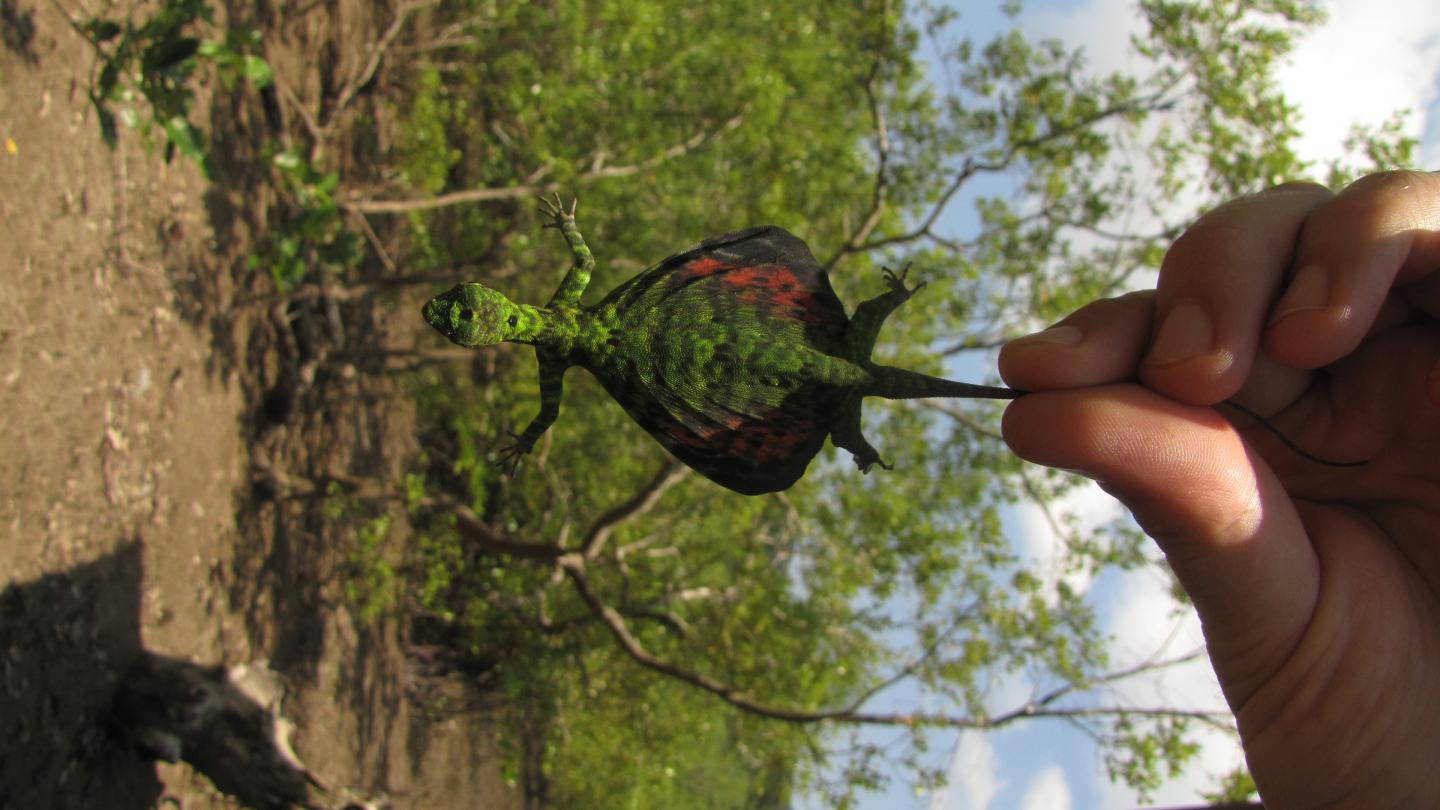 The team of PhD student Danielle Klomp, Dr. Terry Ord, Dr. Devi Stuart-Fox and Dr. Indraneil Das traveled to Borneo and observed two populations of a gliding lizard that have different colored gliding membranes and occupy very different habitats. One population has red gliding membranes, which match the color of the red falling leaves of their coastal mangrove forest habitat. The other population has dark brown and green gliding membranes, which match the colors of falling leaves in their lowland rainforest habitat.