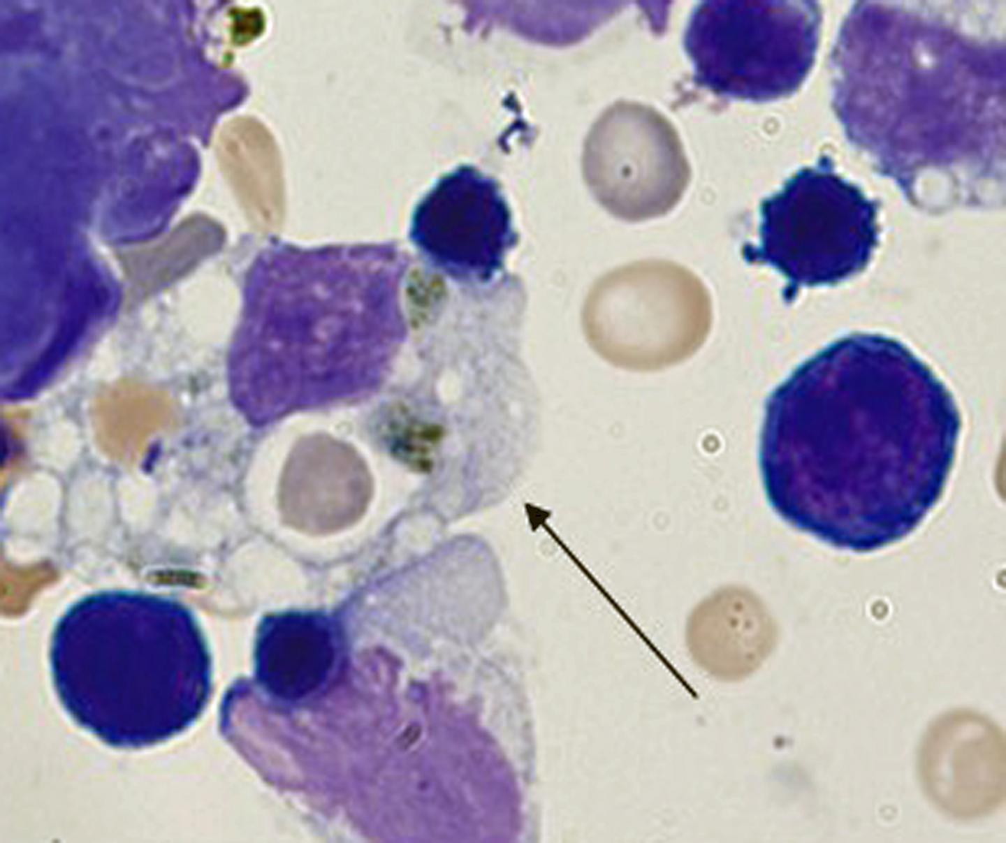image: This is a microscopic photo of a blood smear from a transgenic mouse that mimics the human immune disorder, secondary HLH (hemophagocytic lymphohistiocytosis). The image shows macrophage immune cells (indicated by arrow) flooding healthy tissue cells during a cytokine storm caused by HLH in a very similar fashion t what occurs in patients with severe COVID-19 disease. Researchers reporting in the Journal of Allergy and Clinical Immunology say the HLH data were a factor in a decision to test the anti-inflammatory drug ruxolitinib (used to treat secondary HLH) in patients with COVID-19 in China.