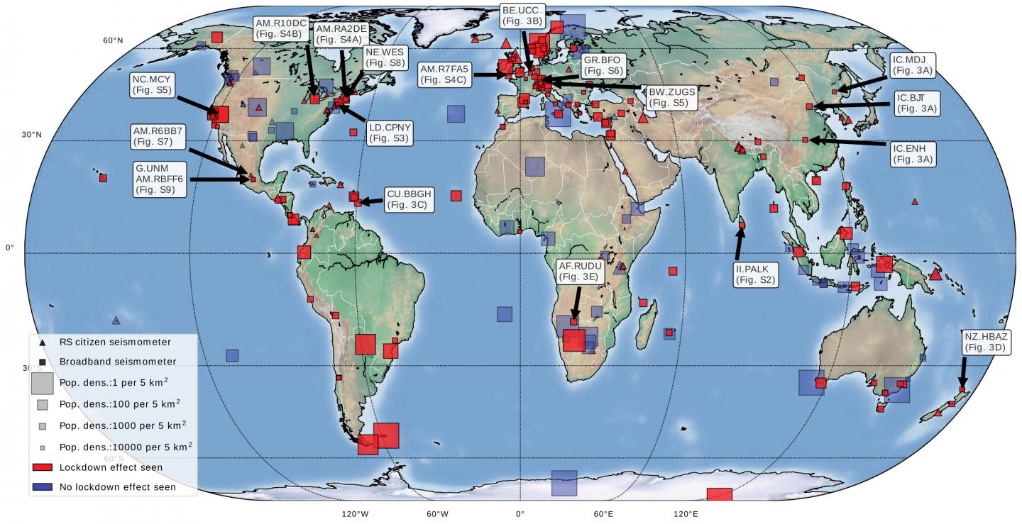 image: Locations of the 268 global seismic stations used in the study. Lockdown effects are observed (red) at 185 of 268 stations. Symbol size is scaled by the inverse of population density to emphasize stations located in remote areas.