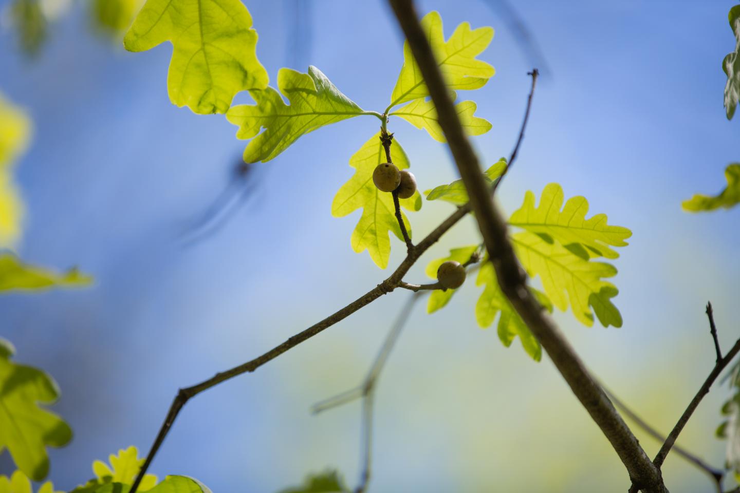 image: White oak leaves and marble-sized galls. Galls are growths on plants caused by invasions of parasites, viruses, fungi and bacteria -- making galls centers of activity for both attacks on a plant's system and a plant's defense of those attacks.