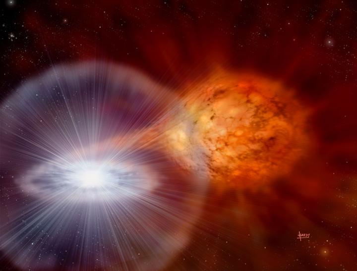 image: Artist's interpretation of the explosion of a recurrent nova, RS Ophiuchi. This is a binary star in the constellation of Ophiuchus and is approximately 5,000 light-years away. It explodes roughly every 20 years when the gas flowing from the large star that falls onto the white dwarf reaches temperatures exceeding ten million degrees.