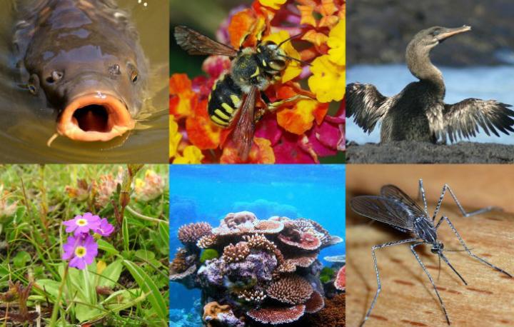 image: Clockwise from top left: broadcast-spawning fish such as carp; small ectothermic insects including pollinating bees; endemic animals with limited latitudinal or elevation ranges such as the flightless cormorant; disease vectors including mosquitoes; coral species that are important to highly diverse reefs; and endemic plant species including the Scottish primrose.