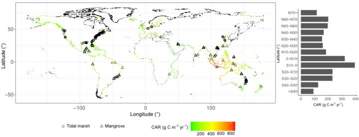 image: The spatial distribution of tidal wetlands and the observed C accumulation rate (CAR) points. The right panel indicated the arithmetic average CAR at every 10-degree bands of latitude.