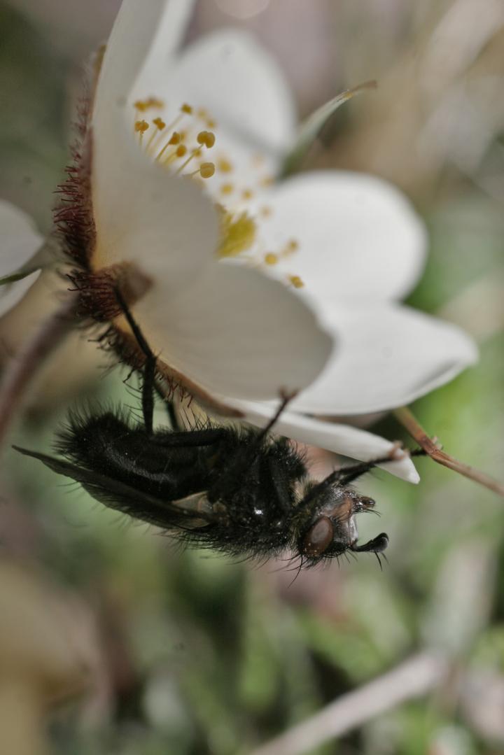 image: Parasitic flies are some of the most abundant predators of the Arctic. Here an adult fly of Peleteria aenea is having a rest from hunting on the underside of an Avens flower. Photo: Tuomas Kankaanpää.