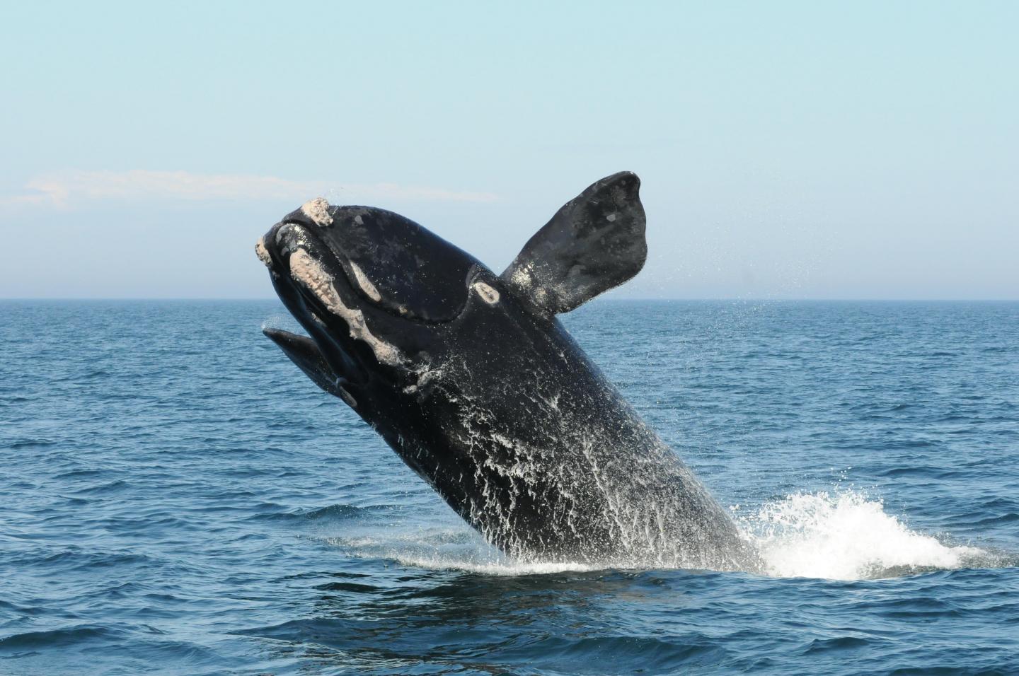 image: A North Atlantic right whale breaches in the Bay of Fundy. New research shows that rapid warming in the Gulf of Maine's depths is changing food availability and increasing risk to these whales -- one of the world's most endangered animals.