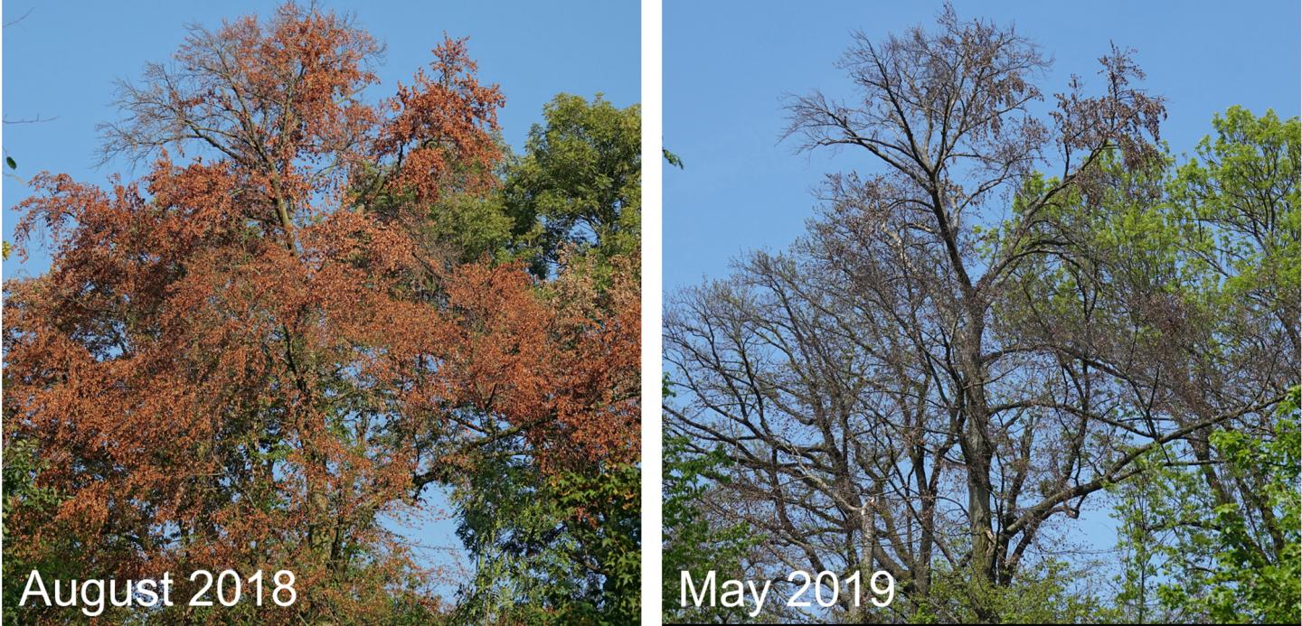 image: Premature leaf senescence of a beech tree during the 2018 event, followed by lacking leaf flushing and canopy dieback in the following year.