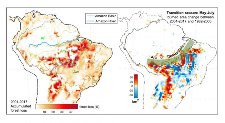 Fire burning data derived from satellites observation indicated more fires occurring along the "Arc of Deforestation", a curve at the southeastern edge of the forest where deforestation is the most rapid. In the study, they used multiple satellite data products and climate reanalysis to ensure consistency and reliability.