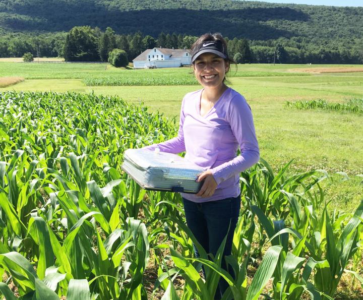 image: Lead researcher Maria Ponce de Leon, a former graduate student in plant science, carries a nitrous oxide emissions chamber into a corn field at Penn State's Russell E. Larson Agricultural Research Center to measure the amount of the potent greenhouse gas given off by the crop.