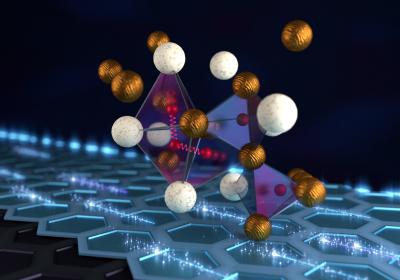 image: Illustration of a zirconium vanadium hydride atomic structure at near ambient conditions as determined using neutron vibrational spectroscopy and the Titan supercomputer at Oak Ridge National Laboratory. The lattice is comprised of vanadium atoms (in gold) and zirconium atoms (in white) enclosing hydrogen atoms (in red). Three hydrogen atoms are shown interacting at surprisingly small hydrogen-hydrogen atomic distances, as short as 1.6 angstroms. These smaller spacings between the atoms might allow packing significantly more hydrogen into the material to a point where it begins to superconduct.