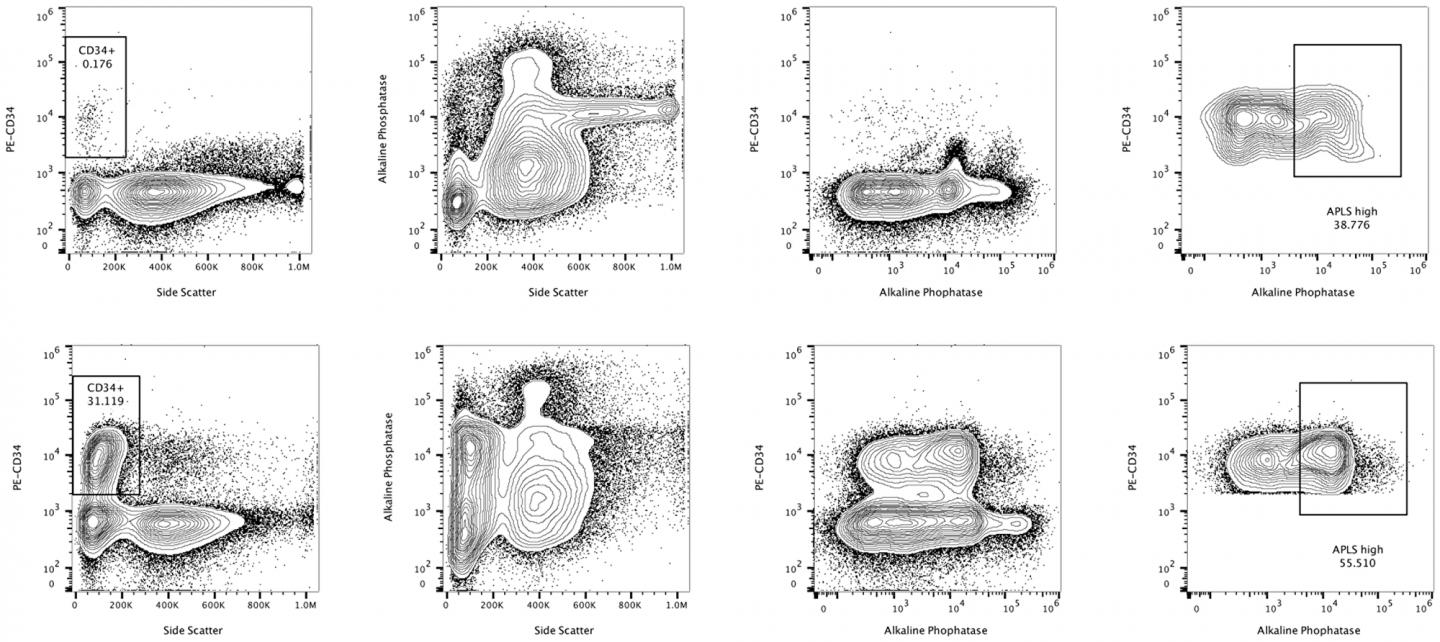 image: Representative flow cytometric study of the alkaline phosphatase activity in a patient of the ALP ? 12% group. Alkaline phosphatase positive cells are represented in combination with CD34 staining at diagnosis (upper row) and after relapse (lower row). Reference contour plots for two bone marrow aspirates are compared in the same patient, displaying high levels of alkaline phosphatase activity in combination with CD34 staining. The statistics in the region represents percentage of the gate.