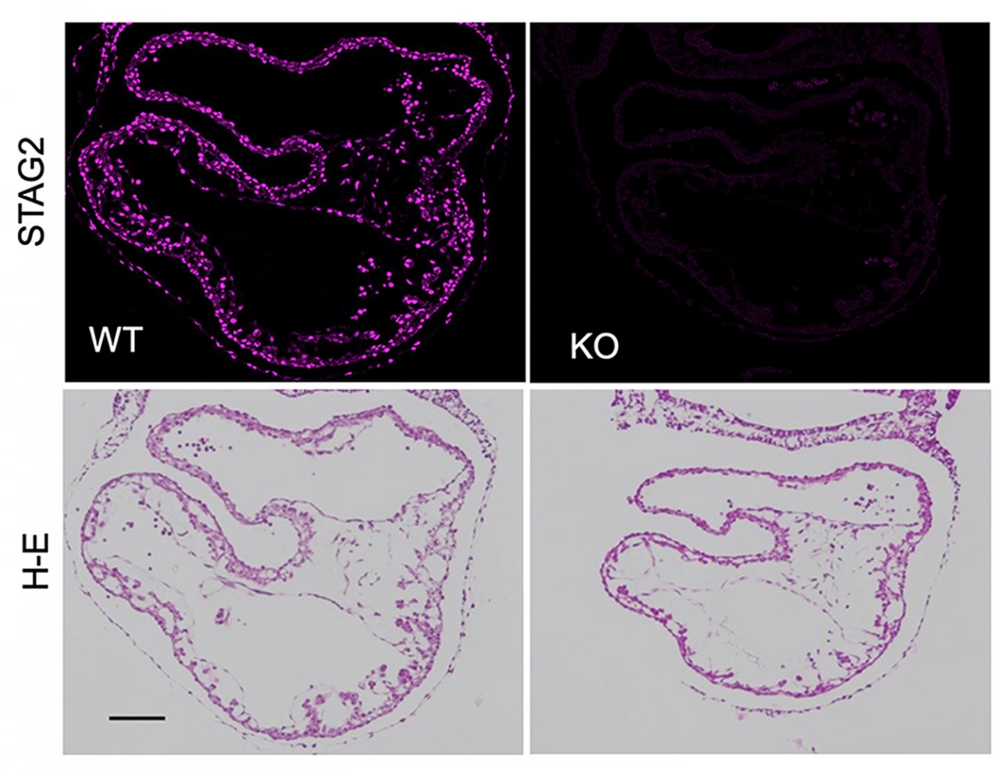 image: Transversal sections of wild type (WT) and STAG2 knock out (KO) murine embryos at day 9.5 of gestation stained with antibodies against STAG2 (top) or hematoxilin-eosin (H.E, bottom) reveal the smaller size and the malformation of hearts developed in the absence of cohesin STAG2.