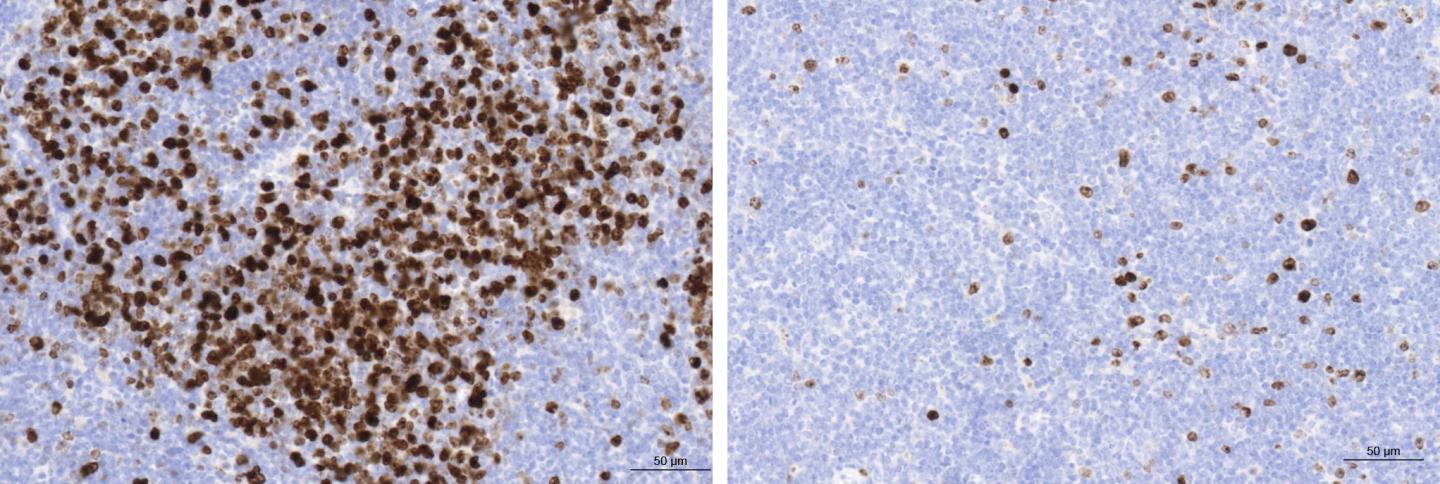 image: On the left, follicular lymphoma in a mouse model with abundant multiplying B cells dyed brown. On the right, inhibition of this multiplication using treatment with rapamycin.