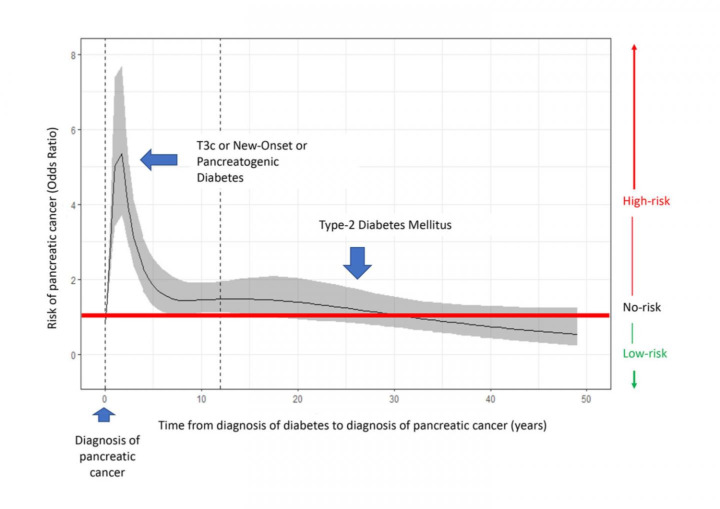 image: Nonlinear association between the risk of pancreatic cancer and the time elapsed between the diagnosis of diabetes and that of pancreatic cancer. Point 0 represents the diagnosis of pancreatic cancer. Diagnosis of diabetes less than 2 years before cancer diagnosis is strongly associated with the risk of this tumour.